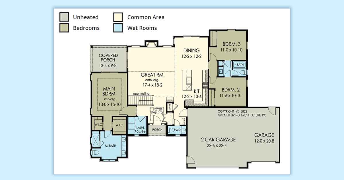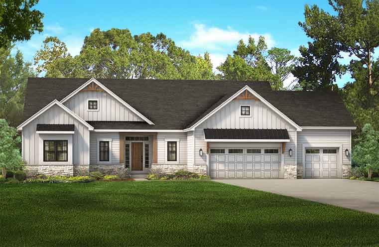 Stylish ranch home in Rochester NY featuring an open floor plan, covered porch, and spacious 3-car garage.